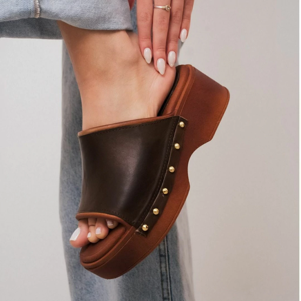 Zueco de cuero con base ancha y cómoda, ideal para sumar altura sin perder estabilidad. Su diseño minimalista se realza con detalles de tachas laterales que aportan un toque moderno y canchero. Perfecto para looks urbanos y versátiles que buscan comodidad y estilo en un solo calzado.
